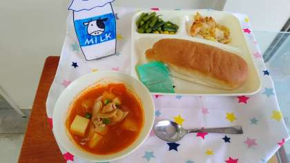 ケッチャップ煮 さんどまめとコーンのソテー りんごのクラフティ コッペパン いちごジャム 牛乳