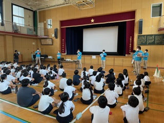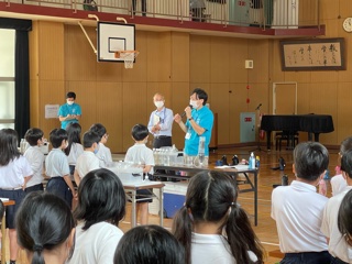 今日、4年生は、出前水道教室がありました。まず最初に水が浄化される仕組みをDVDで見てから、水の浄化実験をしました。淀川の泥水がみるみる透明になっていく様子を見て、子どもたちは大興奮でした。その後、大阪市の水道水とミネラルウォーターの飲み比べをしました。美味しい大阪市の水道水に驚いていました。