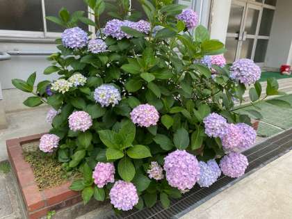 今は梅雨の中休みですが、この時期らしく学校のアジサイも美しく咲いています。校庭や、ふくふく広場など、たくさんの場所で見ることができます。
