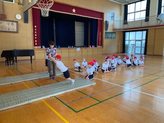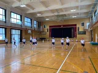 5月中旬から、どのクラスも体力テストを行っています。講堂で、反復横跳びや20mシャトルランなど、子どもたちの体力を測定しています。子どもたちはどの種目にも全力で取り組んでいます。