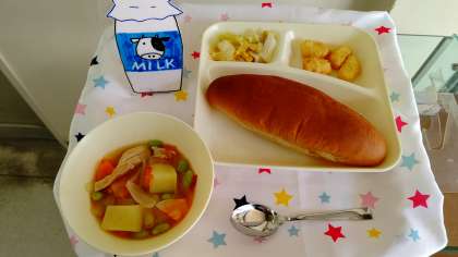 『フレッシュトマトのスープ煮』は、給食では、トマトは缶詰めの物を使用することが多いのですが、今日は旬の生のトマトを使いさっぱりとした味付けで、暑い日でも食べやすい献立でした。