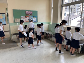 今月から、たてわり清掃が始まりました。福島小学校では、月一回たてわり班で掃除をしています。6年生の子達が1年生の子もできる仕事を考えて、いっしょに清掃をがんばっています。掃除が終わった後は、しっかりと反省会も行っています。