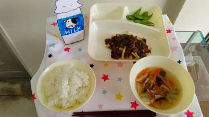 チンジャオニューロウスー ハムと野菜の中華スープ えだまめ ごはん 牛乳
