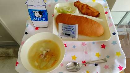 サーモンフライ 豆乳スープ キャベツのソテー コッペパン ブルーベリージャム 牛乳
