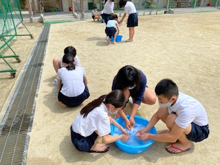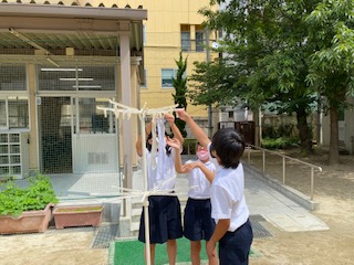 梅雨の晴れ間を利用して、6年生は家庭科の洗濯実習をしました。普段は洗濯機を使っていると思いますが、今回は、洗剤の量をきちんと量って、靴下を手洗いしました。たらいに水を入れて洗濯する機会はあまりないので、子ども達はとても楽しんで活動していました。