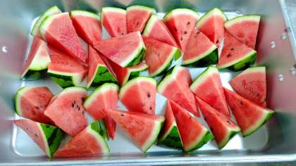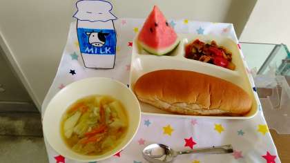 夏が旬の『すいか』は、1年に1度だけ登場します。丸いすいか1個を、調理員さんが、64等分に切り分けてくださいます。『鶏肉と夏野菜のソテー』は、鶏肉を主材に、夏が旬のなす、きゅうりや年に1回だけ使用できる赤ピーマンを使用し、さっぱりとした味付けの献立で美味しかったです。