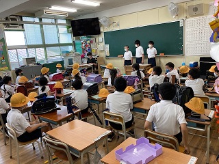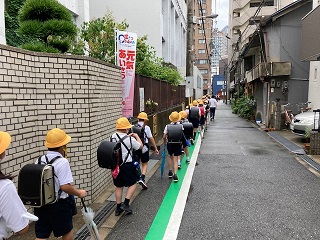 本日(7日)5時間目に、地域ごとに、登校班での1学期のふり返りをしました。地域に危険な場所がないかも確認しました。集団下校では、きちんと並んで下校することができました。
