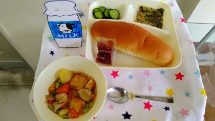 『もずく入りヒラヤーチー』のヒラヤーチーとは、沖縄の家庭料理で『平焼き(平たく焼く)』という意味の料理名です。みりん、米酢、濃い口しょうゆで作ったタレをかけ、食べます。もずくが少し苦手な児童もいましたが、ぱくぱく美味しそうに食べている児童もたくさんいました。