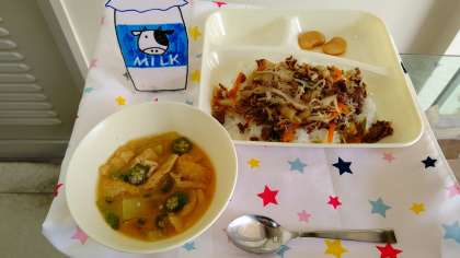 『とうがんのみそ汁』は、夏が旬のとうがんとオクラ、更にうすあげを使用したみそ汁です。児童に人気のボリュームのある牛丼との組み合わせなので、みそ汁の具は少なめにしています。食べ応えのある献立でした。