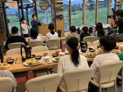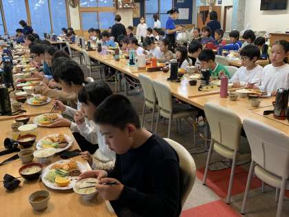 楽しみにしていた夕食の時間になりました。食事係が責任をもってみんなの食事の準備をしました。宿舎でも、約束を守り静かに食事をしています。
