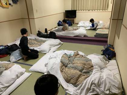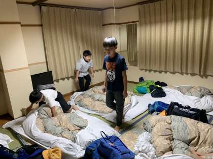 就寝の準備の様子です。シーツを敷くのに戸惑っている子どももいましたが、班のみんなで協力しながら準備をしていました。