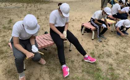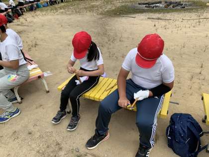竹から削って箸作りをしています。太さも自分で考えて作っています。完成を目指して一生懸命頑張っています。