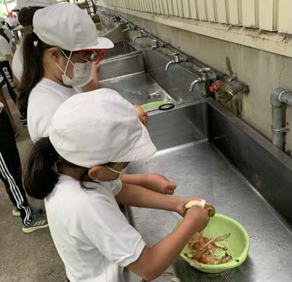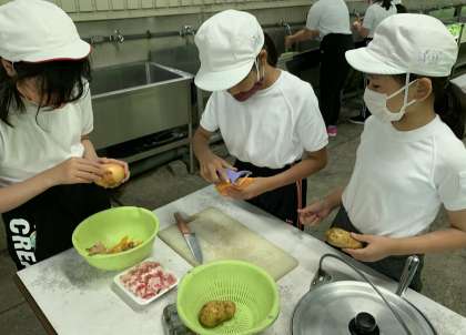 カレー作りをしました。今年度はコロナの影響もあり、調理実習が出来ていないので、初めての調理実習です。約束や作り方を確認し、班のみんなで作りました。