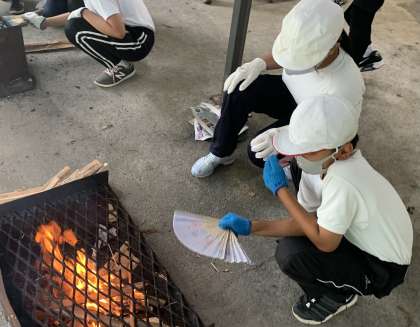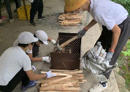 火起こしから、自分たちでやります。新聞や木を自分たちで組み立てます。全部の班、無事火起こしも成功しました。