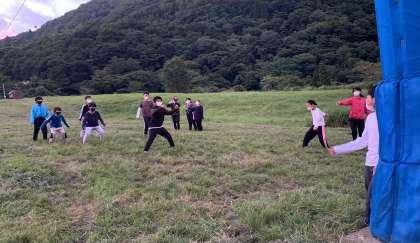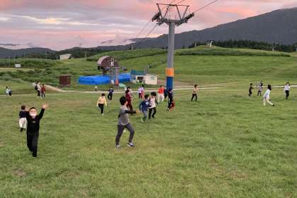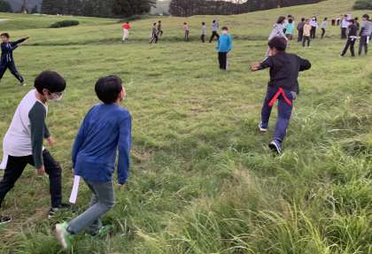 宿舎の前が広い芝になっているので、そこで特別に自由時間がありました。福島小の貸し切りでした。しっぽとりやだるまさんがころんだや散歩など好きなことをして過ごしました。