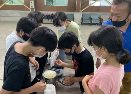 いよいよ完成したアイスを食べました。ふたを開ける前から「わくわくする〜!」と目をキラキラさせていました。味も美味しかったみたいで、容器の中身が無くなるまで綺麗に食べました。