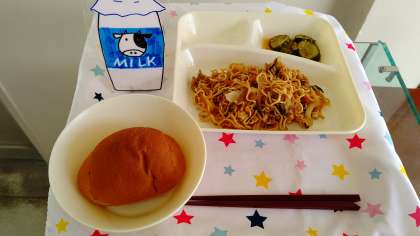 オイスターソース焼きそば きゅうりの中華あえ 黒糖1/2パン 牛乳