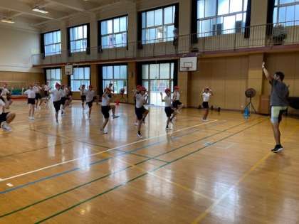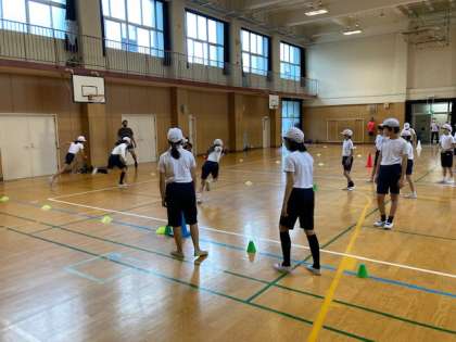 走る時には、姿勢・バランス・目線が大事であることを教えていただきました。お話のあと、実際に教えていただいたことを活かしながら、走る練習をしました。子どもたちは姿勢も随分と良くなり、かっこよく走る姿が見られました。