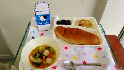 『あげぎょうざ』は、児童に大変好評な献立です。今日も「ぎょうざ やったー!」の声が、たくさん聞こえてきました。大粒の甘い巨峰も3粒ずつつきました。