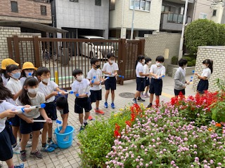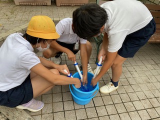 4年生は、空気や水の性質を学習した後、水てっぽうを使って「ふくふく広場」の植物に水やりをしました。どこまで水が飛ばせるか競争している子たちもいました。学習園のヘチマの観察もできました。