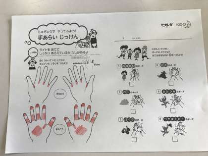 テーマは、「みんなで手洗い」です。専用のローションを手のひら、手のこうにぬり、