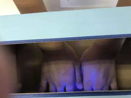 はんかちでふいて、ブラックライトボツクスに手をかざすと、洗い残しのところが光ります。
