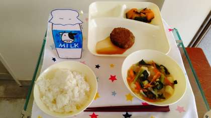 『和風ハンバーグ』は、焼き物機で焼いたハンバーグに、たれをかけています。今日は、1年生から5年生まで秋の遠足に出かけていたので、6年2クラスだけの給食でした。