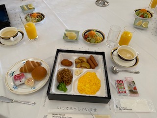 食事係のメニュー紹介後、朝食を食べました。朝からボリューム満点です。