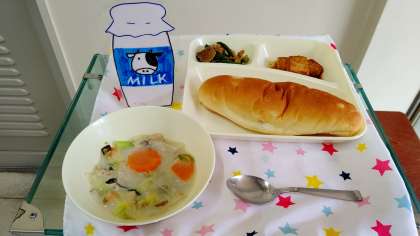 『はくさいのクリーム煮』は、鶏肉、白菜、玉ねぎ、チンゲンサイ、にんじん、生のしいたけを使用し、牛乳とクリームを加えて煮でん粉でとろみをつけた中華風のクリーム煮です。はくさいのクリーム煮に、色々な形のラッキーにんじんが入っていました。