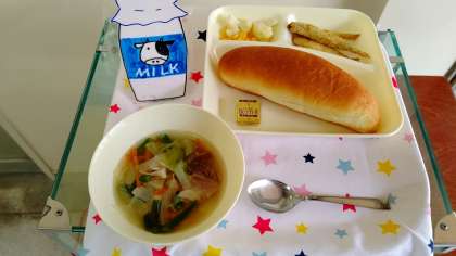 わかさぎフライ スープ カリフラワーとコーンのサラダ コッペパン バター 牛乳