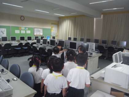 今日(13日)の3時間目、1・2年生合同で学校たんけんを行いました。1年生は、2年生とグループになって校内をまわりました。2年生は、特別教室について説明したり関係するクイズを出したりしていました。校内をまわるグループの2年生は、1年生に気づかいながら優しく案内していました。