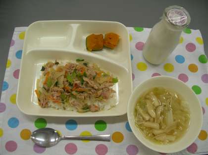 豚丼は、豚肉のほかにたまねぎ、にんじん、青ねぎ、糸こんにゃくを使った具だくさんの丼でした。少し甘くして、子どもたちが食べやすい味にしました。好評でした。(栄養教諭)