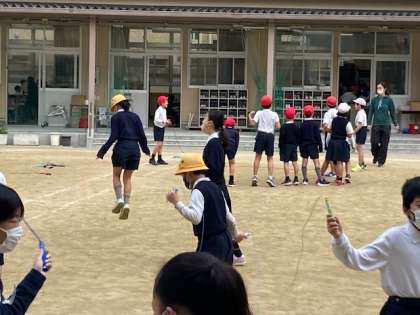 今日からなわとび週間が始まりました。この期間は体力づくりの一環として、休み時間に大縄や短縄を練習します。早速、友達とアドバイスをし合いながら楽しく跳んでいる姿が多く見られました。