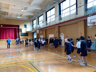 講堂では高学年が大縄跳びの記録をとっていました。練習の成果もあり、いくつかのクラスは、2分間の間に100回以上跳ぶことができました。