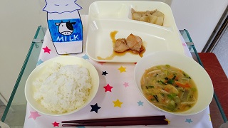 鶏肉の甘辛焼き みそ汁 だいこんの煮もの ごはん 牛乳