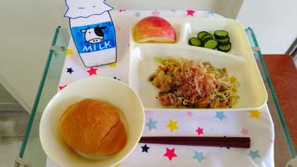 和風焼きそば きゅうりのしょうがづけ りんご 2/1黒糖パン 牛乳