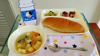 あげシューマイ とうふのスープ ツナとチンゲンサイの炒め物 黒糖パン 牛乳