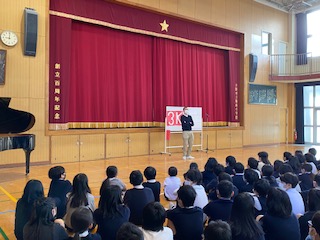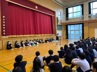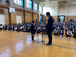 今日(24日)、2学期の終業式を行いました。最初のスピーチでは、各学級の代表者が2学期の振り返りや冬休み、3学期に向けてなどの話をしました。どの学年の児童もしっかりと練習したようで、大きな声で堂々と発表することができていました。