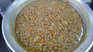 『ミートボールと野菜のカレー煮』は、肉だんごを主材に、玉ねぎ、だいこん、にんじん、しめじ、青みにむきえだまめを加え、カレールウで味付けした煮ものです。児童に大好評の献立です。今日は、寒かったので、体が温まる献立でした。