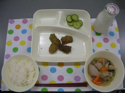 「ちくわのいそべあげ」は、衣に「青のり」を混ぜてあげたものです。うすめの衣でしたが、「青のり」がちくわの風味をより引き立てておいしかったです。(栄養教諭)