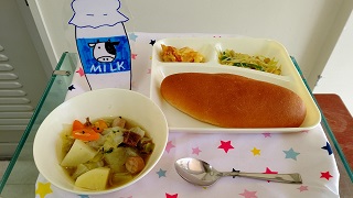 『ポトフ』は、肉や野菜をじっくり煮込んだフランスの家庭料理の一つです。牛肉(角・肩ロース)、ウインナー、じゃがいも、キャベツ、にんじんを使用し、チキンブイヨンで味付けしたボリュームのある煮物です。青みにパセリを使用しています。デザートは、大好評の桃のクラフティです。「美味しかった」とたくさんの児童が声をかけてくれました。
