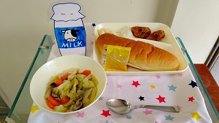 『カリフラワーのサラダ』は、2月まで使用できる旬のカリフラワーを蒸し、砂糖、塩、米酢、薄口しょうゆ、綿実油を使用したドレッシングをかけあえます。さっぱりとした味つけです。給食の白身魚のフリッターは、「たら」を使っています。サクサクで食べ応えがあり、洋風煮といっしょに美味しく頂きました。
