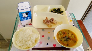 『こまつなの煮びたし』は、冬が旬のこまつなと、旨みを加えるために、相性の良い豚肉を組み合わせています。みそ汁は、さつまいもが入った甘めの味です。鶏肉のゆず塩焼きは、ゆずがきいてさっぱりとした味つけでごはんによく合う献立でした。