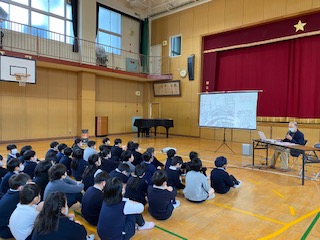 本日、3年生は「昔のくらし」について学習をしました。寿老会の方に来ていただき、2時間目は、スライドを見ながら、福島区の昔の様子やくらしについてお話を聞きました。