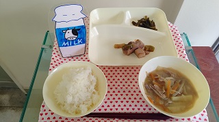 まぐろの甘辛焼き 豚汁 くきわかめのつくだ煮 ごはん 牛乳