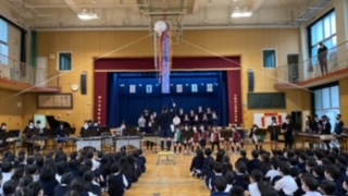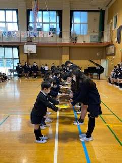 今朝「卒業を祝う会」が行われました。在校生からの寄せ書きのプレゼントを1年生の子たちからお世話になったたてわり班のリーダーに手渡ししました。お礼に6年生から合奏のプレゼントがありました。曲は「美女と野獣メドレー」でした。美しい音色が講堂に響き渡っていました。