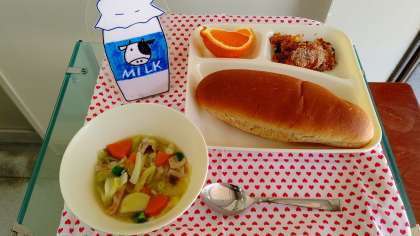 『とうふのミートグラタン』は、主材にとうふと牛ひき肉、大豆(粒状)を使用しています。ミート味のグラタンは、毎回児童に大好評な献立です。『押麦と野菜のスープ煮』は、鶏肉を主材に、押麦、じゃがいも、キャベツ、人参、グリンピース、を使用したスープ煮です。野菜の旨みと、押麦のぷちぷちとした食感が合い美味しかったです。