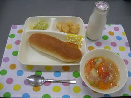 トマト料理の味つけは、難しいように思います。バジルやオレガノを入れると味付けがしやすくなります。ハーブの量は少し多くても、大人も子どももおいしく食べることができると思います。今日の給食は、チキンスープを使い、塩、こしょう、うす口しょうゆで味つけしました。(栄養教諭)