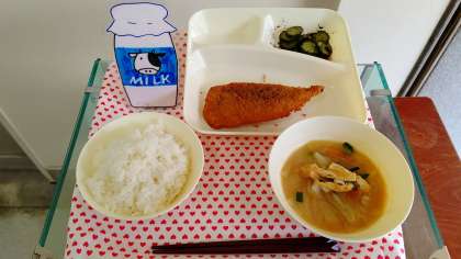 いわしフライ みそ汁 きゅうりの赤じそあえ ごはん 牛乳