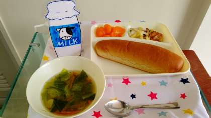 今年度最初の給食です。毎回児童に好評なクリームを使用したマカロニグラタン、レタスのスープ、デザートにみかん(缶)が付きました。今週は、6年生が1年生の給食を取りに来て運搬をしてくれます。1年生も頑張って返却できました。